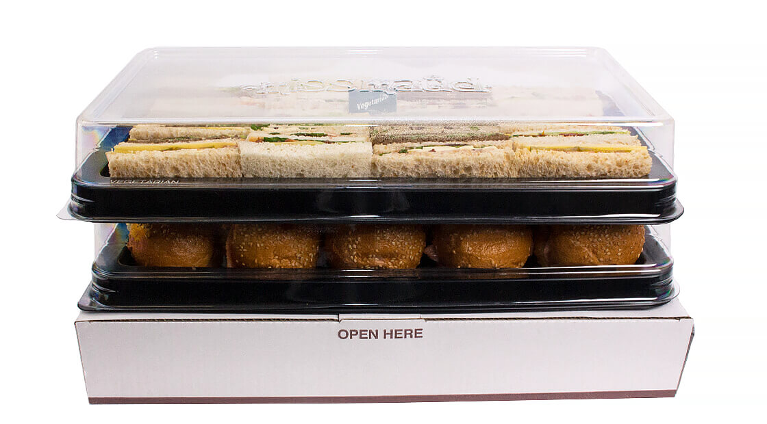 Our platters have a clear lid so it's simply 'lift the lid' for a professional and striking presentation , no more cling wrap and tin foil!