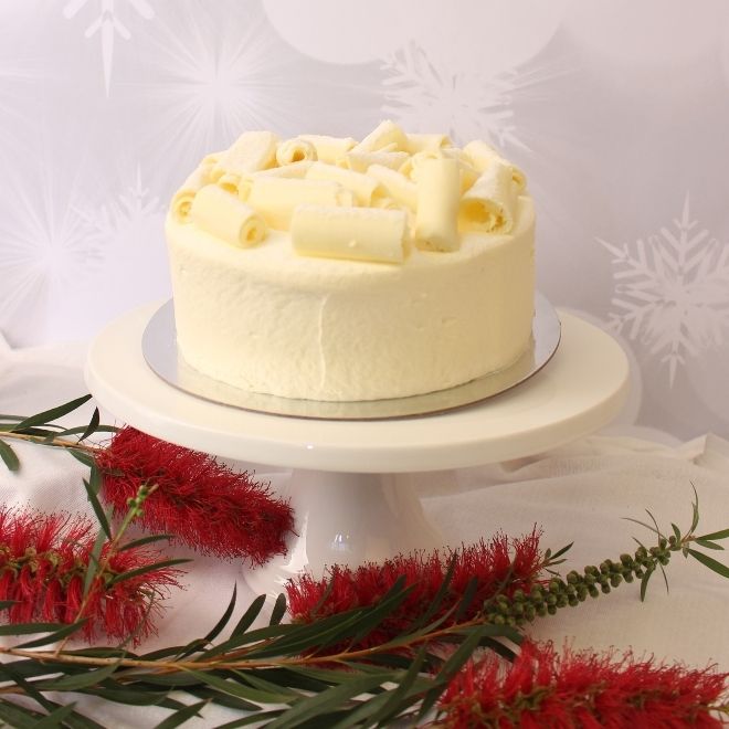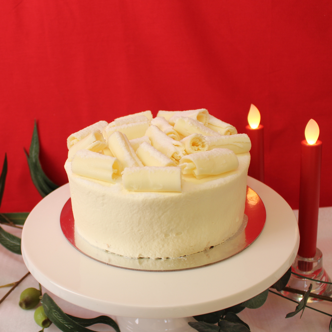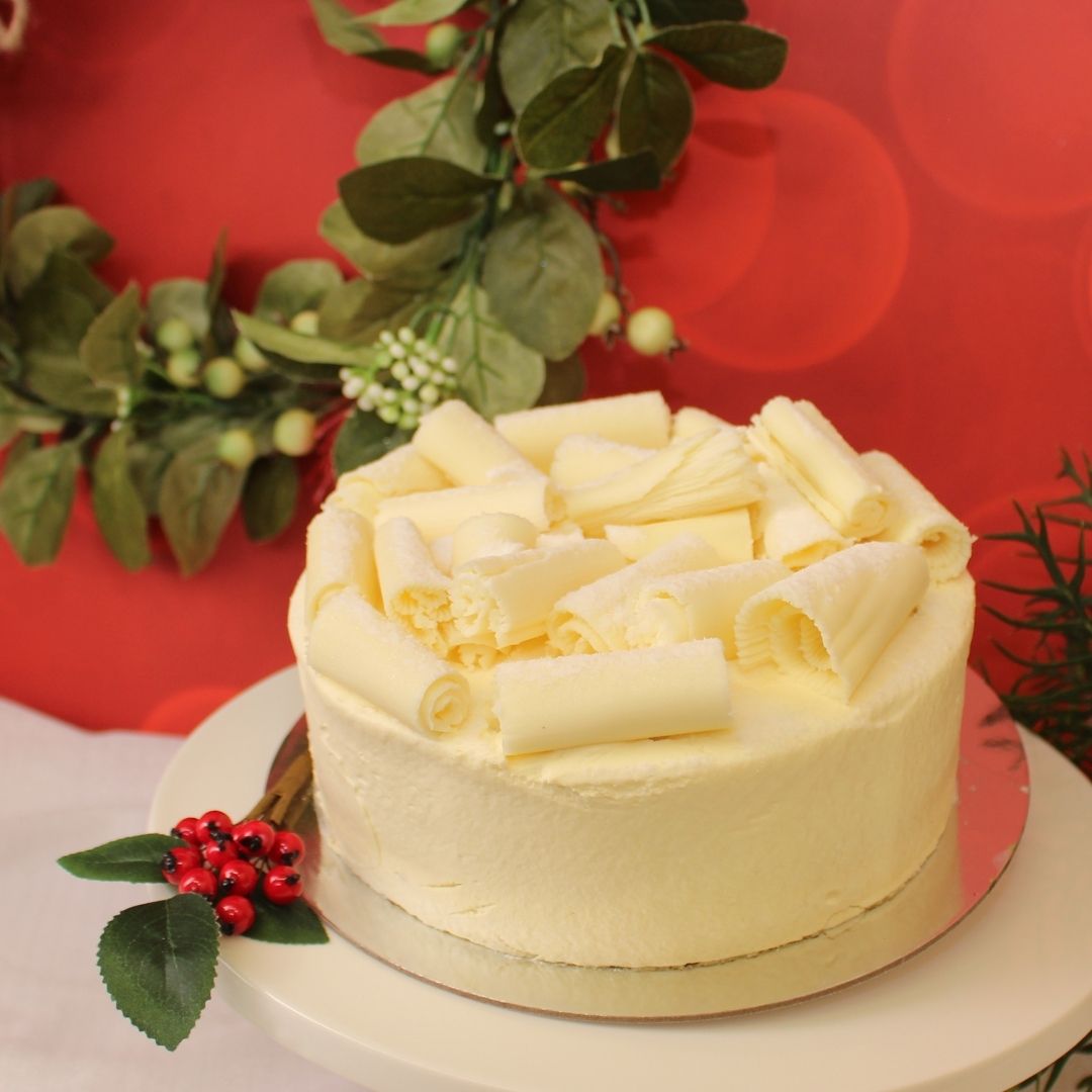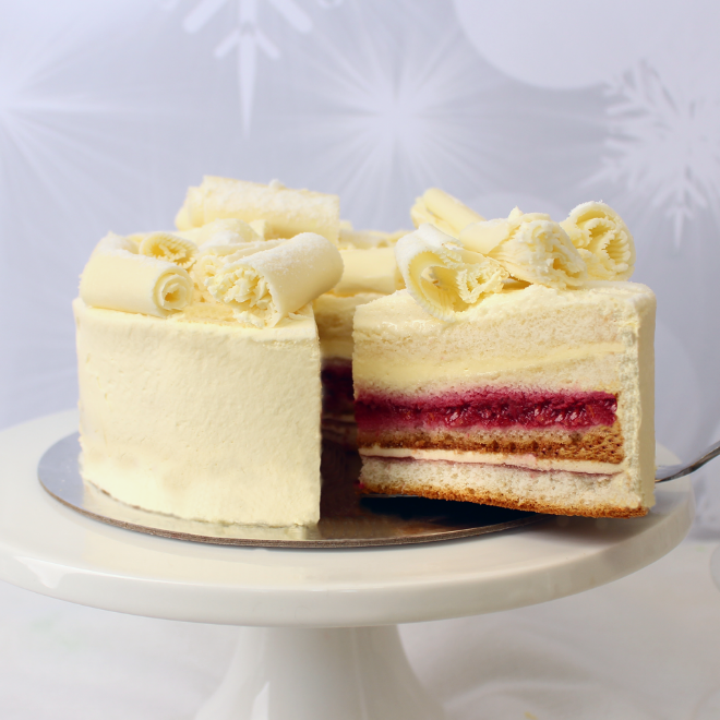 Dreaming of a white Christmas? Then this is probably as close as you'll get! Our White Christmas Torta is a stylish, scrumptious centrepiece for your Christmas table. Four layers of vanilla sponge filled with custard cream, whole raspberries and raspberry jam. Coated in vanilla icing, decorated with white chocolate curls and icing sugar.
