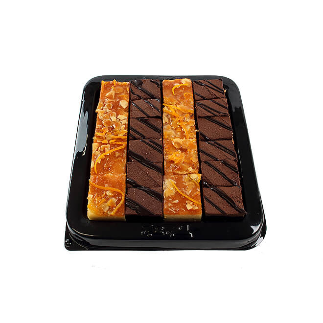 Orange Almond Slice: Flourless (low gluten) orange and almond cake decorated with almond flakes, orange rind and gel.