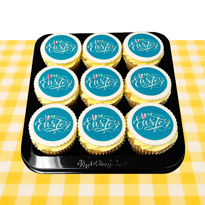 Happy Easter! Celebrate Easter this year with a platter of 9 delicious chocolate and vanilla cupcakes topped with vanilla icing and an edible image.