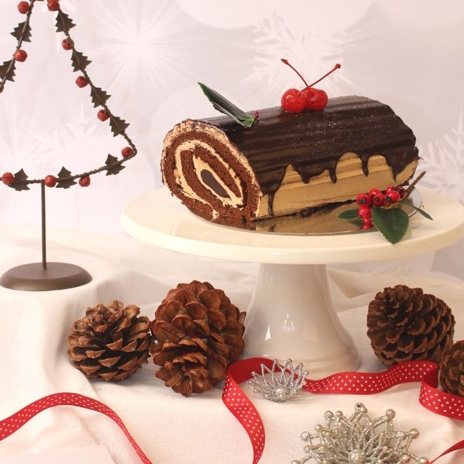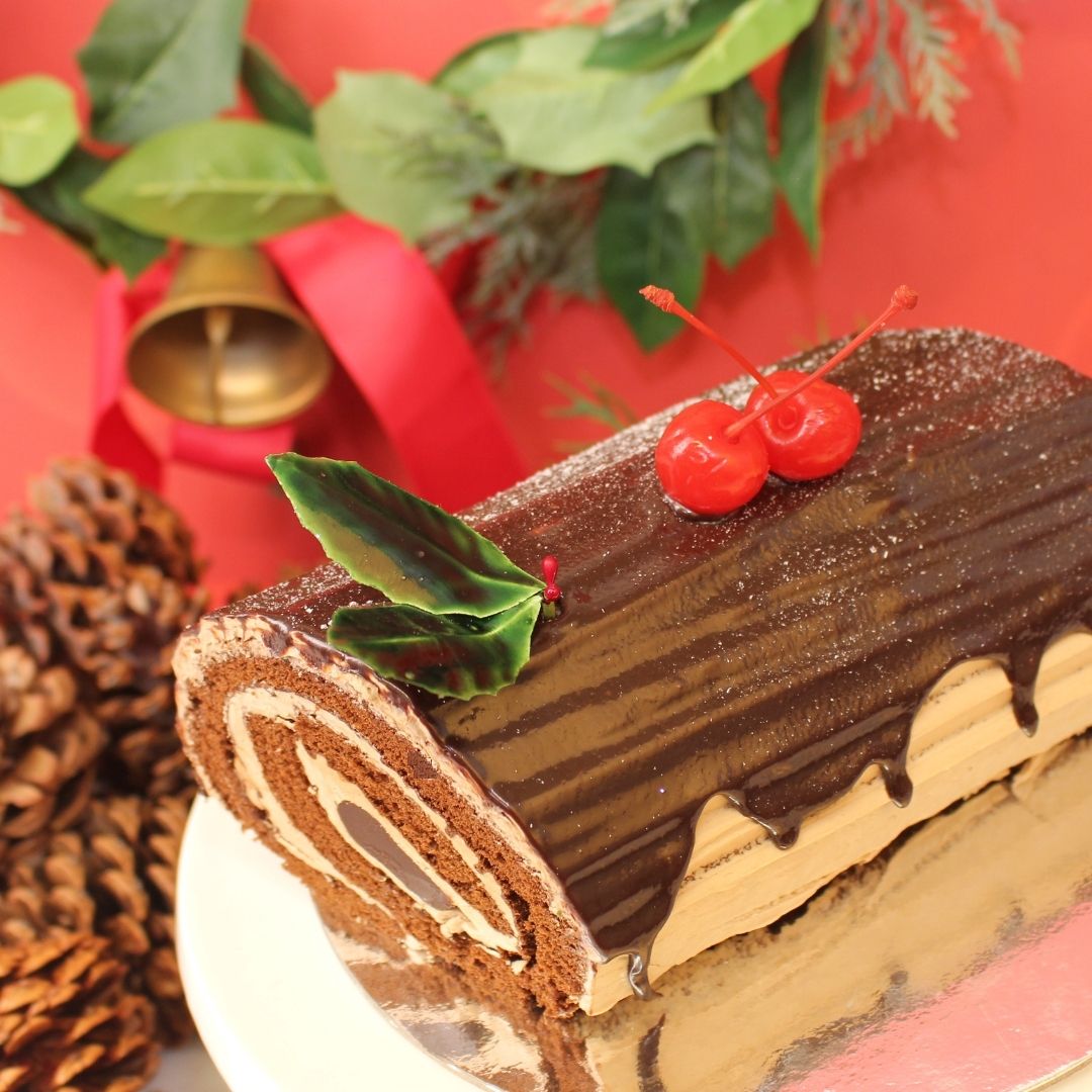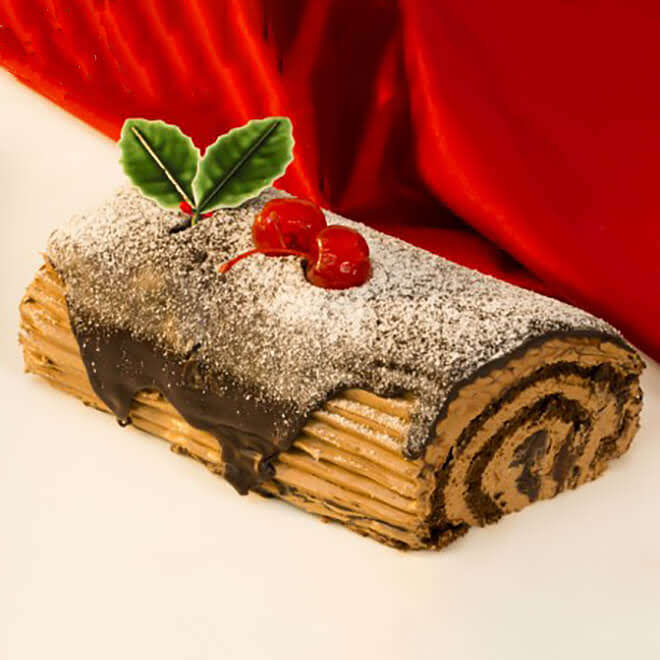 Decorated with holly and red cherries this is a Christmas tradition! A chocolate sponge filled with orange Grand Marnier buttercream. Hand rolled and covered with a rich chocolate ganache and chocolate ganache 'bark'. This one is certainly a delicious centrepiece for your Christmas table.