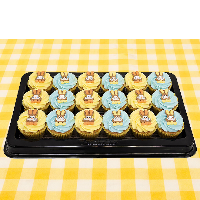 These delicious vanilla cupcakes are topped with blue and yellow vanilla icing and a mixture of Easter bunny confectionery decorations. This ready-to-serve catering platter includes 18 cupcakes and is the perfect addition to your Easter party.