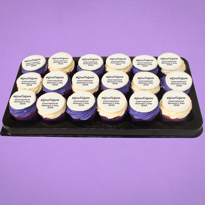 Join us in celebrating the theme of International Women's Day 2026 with these delicious cupcakes. This IWD2026 platter features 18 vanilla and chocolate cupcakes in purple and brown patty pans with alternating purple and white vanilla icing topped with an edible '#GiveToGain’ image.