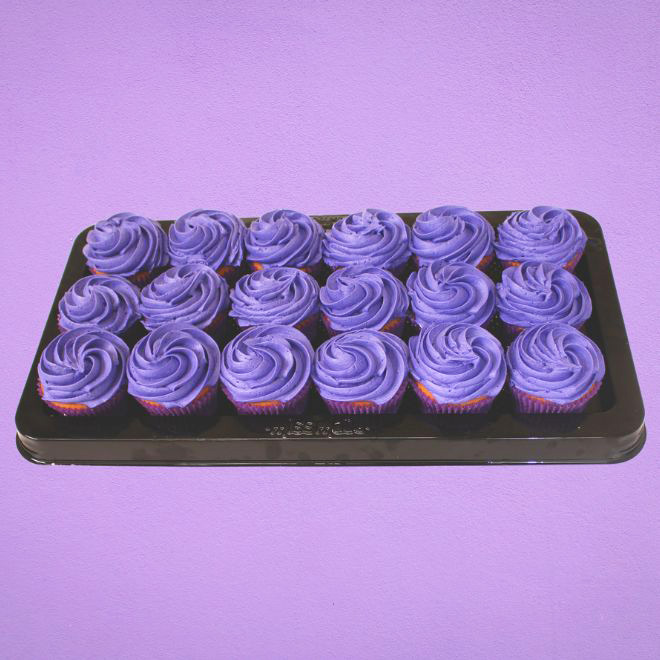 Purple symbolises solidarity and empowerment and was adopted by the suffragettes who advocated for women’s right to vote. This Purple Rose cupcake platter features 18 vanilla and choclate cupcakes in purple and brown patty pans topped with a vibrant purple vanilla icing in the shape of a rose.