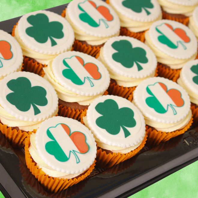 Fly the flag with these delicious St Patrick's Day gluten free chocolate cupcakes, topped vanilla icing and an edible shamrock decoration. There are 18 cupcakes on this platter.