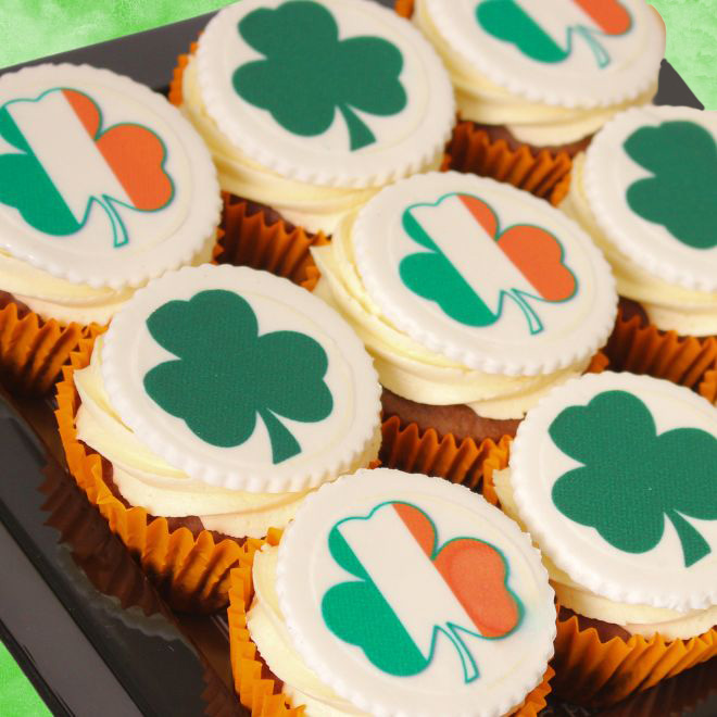 Fly the flag with these delicious St Patrick's Day gluten free chocolate cupcakes, topped vanilla icing and an edible shamrock decoration. There are 9 cupcakes on this platter.